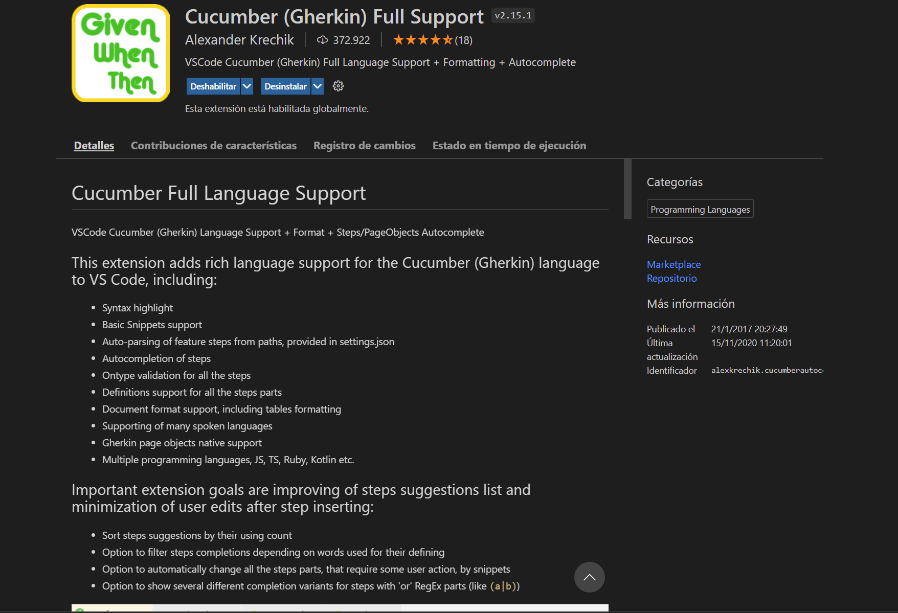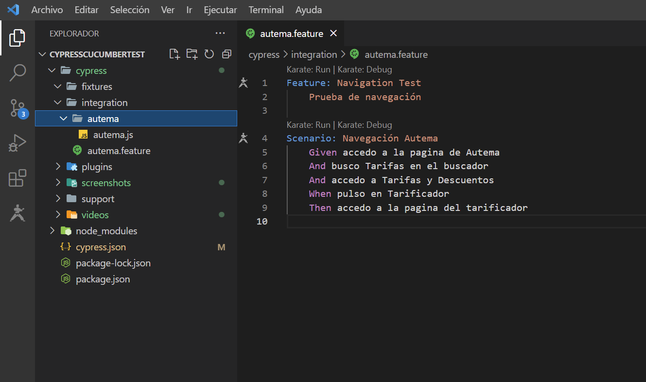 NOTA:En el caso de utilizar Visual Studio Code como editor, se recomienda instalar el plugin "Cucumber (Gherkin) Full Support" para una mejor visualización de los ficheros .feature