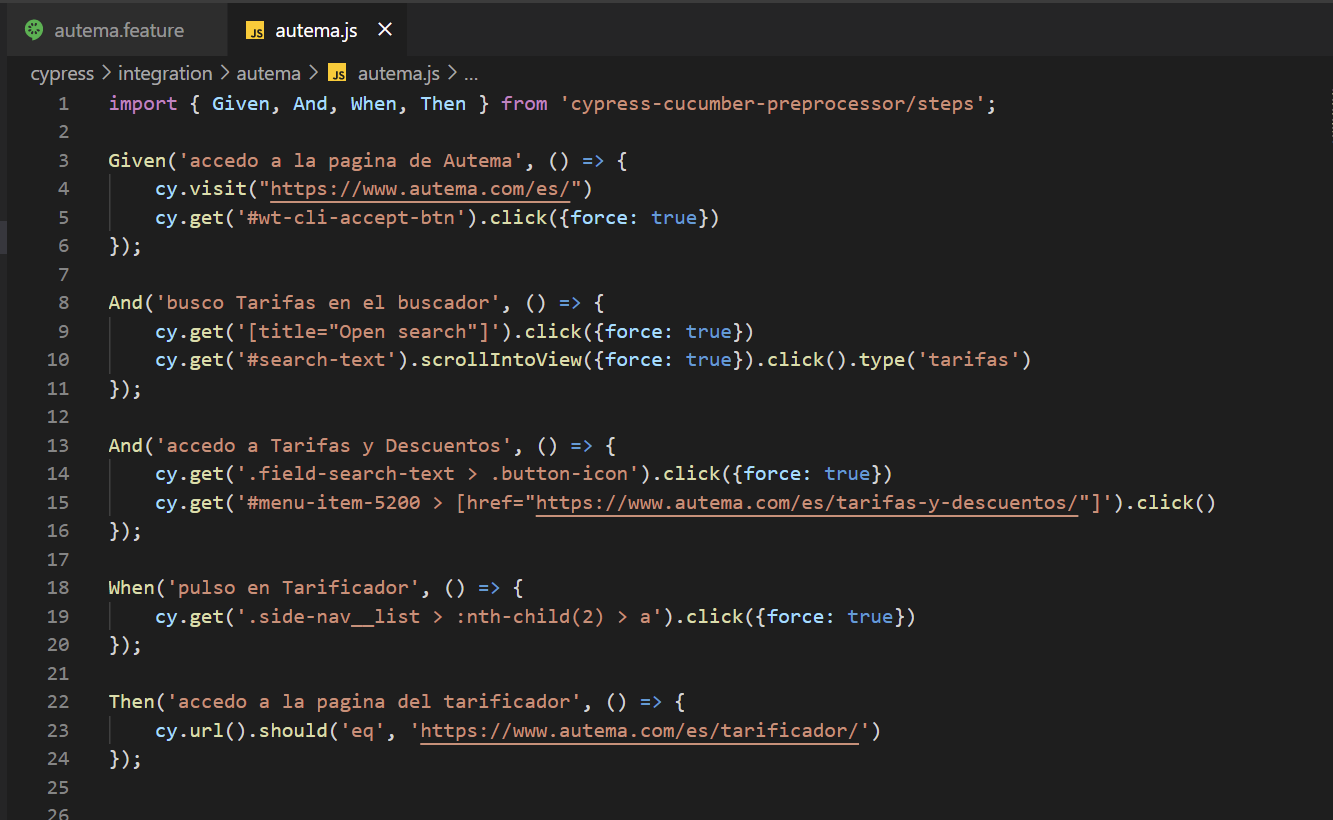 Ahora, creamos una carpeta que deberá tener el mismo nombre que el fichero con extensión ".feature" creado anteriormente. Posteriormente, creamos un nuevo fichero con extensión ".js" y que también deberá tener el mismo nombre.
