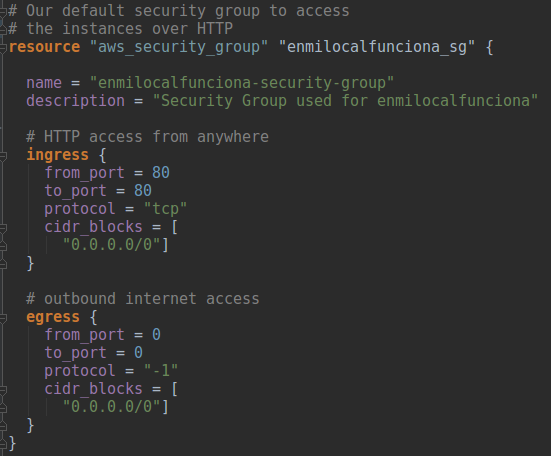 Si nos fijamos, a diferencia del post anterior, no mencionamos ningún elemento de red. Para simplificar la solución hemos optado por utilizar todos los elementos por defecto dentro de una Region (VPC, Subnet, Router e IGW).