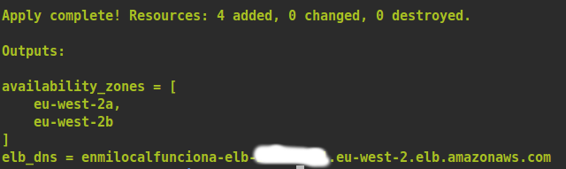 El siguiente paso es la creación de nuestra infraestructura en AWS mediante terraform apply, obteniendo por pantalla los valores de las variables que hemos definido como output: