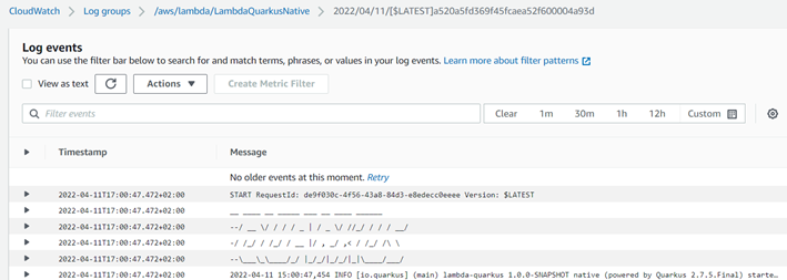 2022-04-07 13:02:17,771 INFO [io.quarkus] (main) lambda-quarkus 1.0.0-SNAPSHOT on JVM (powered by Quarkus 2.7.5.Final) started in 0.671s.