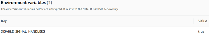 Una vez creada la función lambda, verificar que la variable de entorno DISABLE_SIGNAL_HANDLERS ha sido creada con la ejecución del script, de lo contrario crearla manualmente: