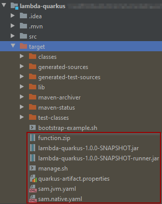 <<artefactId>>+<<version>>+".jar": Corresponde al empaquetado final del artefacto Quarkus construido.<<artefactId>>+<<version>>+"-runner.jar": Corresponde al empaquetado final del artefacto Quarkus versión nativa construido.function.zip: Archivo de despliegue lambdamanage.sh: Script que encapsula las llamadas a AWS CLIsam.jvm.yaml: Archivo que define propiedades para local testing usando SAM CLIsam.native.yaml: Archivo que define propiedades de la versión nativa para local testing usando SAM CLI