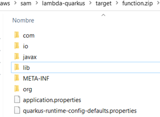 El empaquetado function.zip de la carpeta target contiene el código Lambda finalmente a desplegar en AWS y su estructura interna varía dependiendo el tipo de compilado generado: