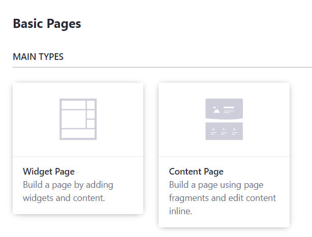A partir de Liferay 7.1 se tienen dos tipos de páginas: widget page y content page. Las widget page son las páginas ‘clásicas’ compuestas por conjuntos de instancias de portlets que se distribuyen dentro de la página mediante el layout. Por el contrario, las content page se componen mediante una secuencia de secciones horizontales llamadas Fragments.