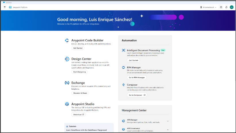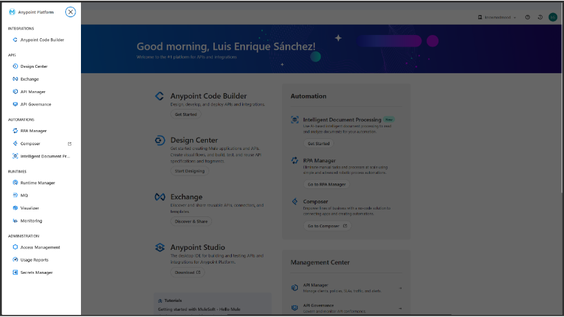 Una vez iniciamos sesión en Anypoint Platform, accedemos al panel principal desde el que gestionaremos todas las herramientas y recursos disponibles. En este punto, es importante familiarizarse con la interfaz general para entender cómo está estructurada la plataforma.