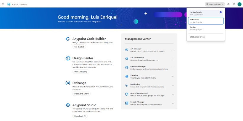 En la parte superior derecha del panel encontraremos el selector de organizaciones. En Anypoint Platform, una organización representa una unidad lógica dentro de la cual se agrupan usuarios, entornos, recursos y permisos.