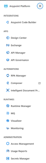 En el lado izquierdo encontramos el menú lateral, que actúa como el eje de navegación principal. Desde aquí se accede a las distintas funcionalidades que ofrece Anypoint Platform, como: