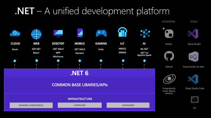 En .NET6 podemos crear soluciones modernas para Azure, AWS, GCP, Windows, Linux, Android, macOS, iOS, tvOS, watchOS, WebAssembly, Xbox, IoT entre otras, todo ello, integrado dentro de una única plataforma global de desarrollo de soluciones.