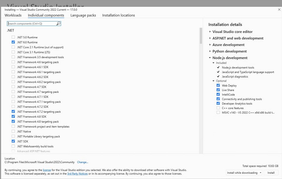 Para personalizar las opciones avanzadas, tenéis disponible la pestaña de componentes individuales que por defecto nos instala .NET6 y .NET Framework 4.7 y 4.8, en la parte derecha opcionalmente podemos seleccionar más extensiones como WebDeploy, LiveShare, IntelliCode, etc.