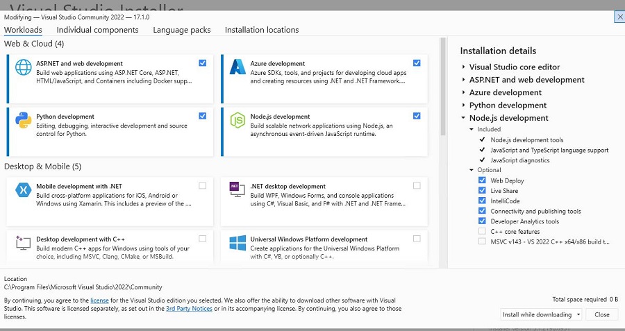 La forma más rápida de instalar todo el ecosistema de desarrollo Visual Studio 2022 y .NET6 de una vez, es sin duda, con el instalador de la herramienta y seleccionar lo que necesitamos en su panel de configuración según el tipo de proyectos que tengamos que desarrollar.