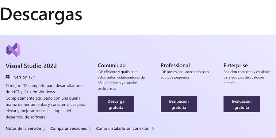 Para descargar Visual Studio tenéis la página oficial, existe la versión Community gratuita y versiones con licencia que también se pueden descargar para probar durante 30 días: