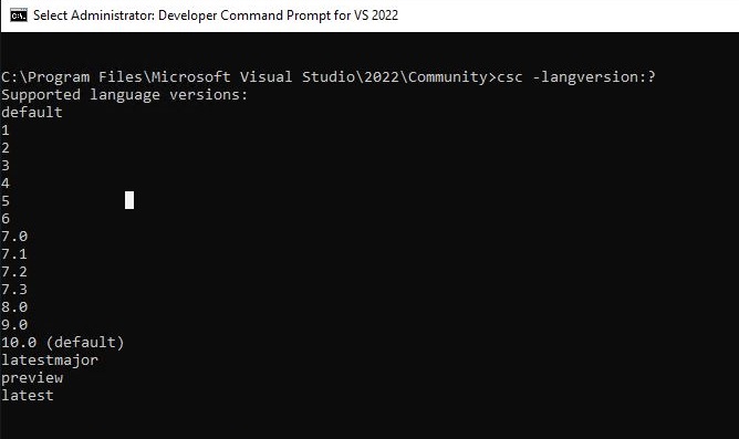 Con la instalación de Visual Studio 2022, también se incluye la versión de C#10 podemos confirmarlo desde la consola de desarrollo del propio Visual Studio.