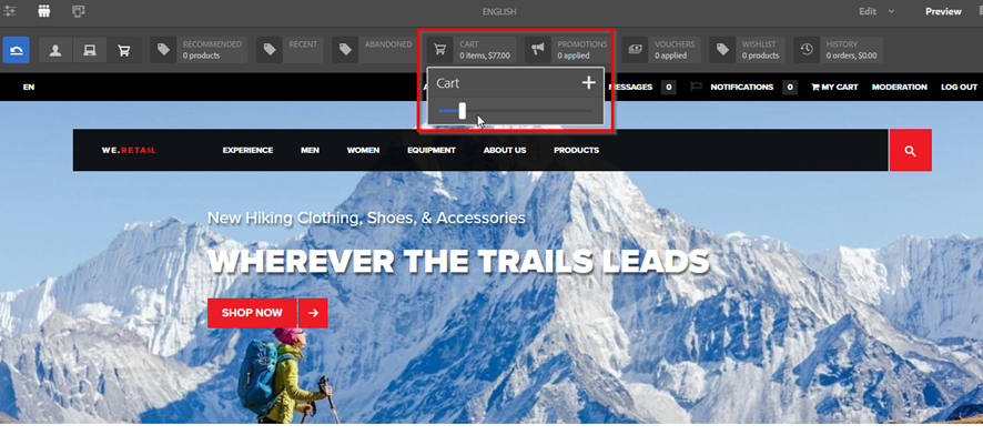 A la hora de editar una página, es posible activar el modo previsualización, de forma que aparecerán una serie de controles que permitirán simular diferentes perfiles de usuarios visitantes de la web. De esta forma, será posible simular y/o consultar aspectos del usuario (ubicación, perfil, etc), características del dispositivo con el que se está visualizando la experiencia digital (tipo de dispositivo, resolución, etc) u otros, como aspectos relativos a las compras (productos vistos recientemente, estado del carrito, promociones, etc), de forma que podremos comprobar cómo verá la experiencia digital cada uno de los posibles usuarios visitantes.