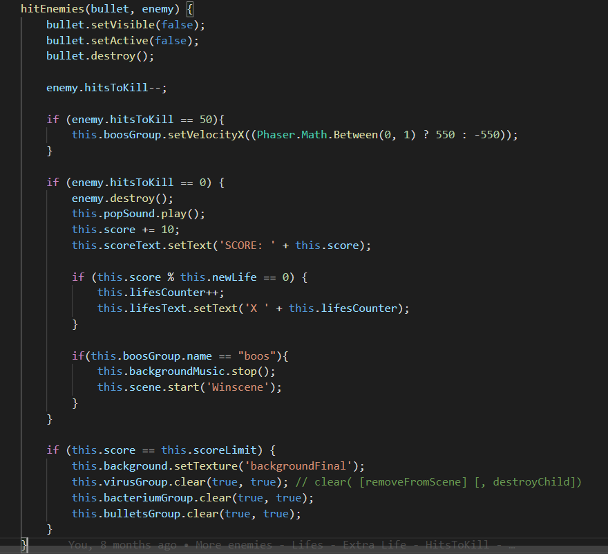 Llegados a ese punto, se eliminarán todos los enemigos en la pantalla, se cambiará el fondo del juego y aparecerá el enemigo final más grande, mas rápido y más duro. Una vez eliminado saltará a la escena de créditos del juego.