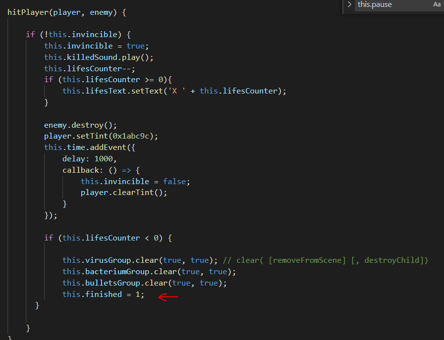 En esta clase, hemos metido un flag booleano llamado "finished" inicializado a 0, para que cuando el personaje pierda todas las vidas, se active a 1 para que cierre la escena principal, pare la música de fondo y lance la pantalla de GamOver. Este flag lo añadiremos el loop del juego con una condición para controlar el cambio de escena y se cambiará a true cuando nuestro personaje pierda todas las vidas.