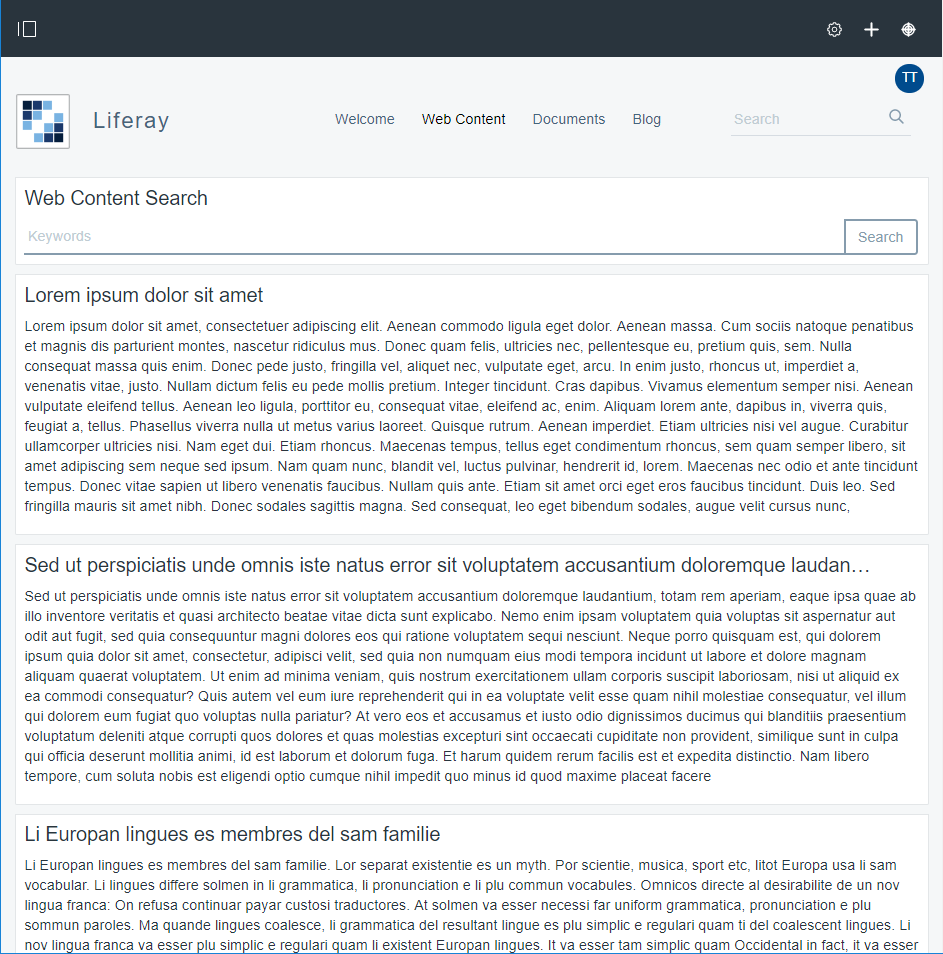 - Web Content Página que muestra contenidos web básicos tipo ‘Lorem ipsum’ mediante portlets Asset Publisher.