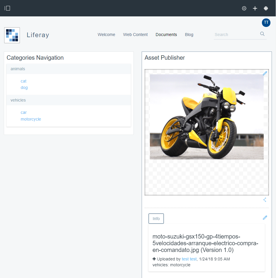 - Documents. Página con dos portlets “Categories navigation” y un “Asset Publisher”. En Document and Media se han añadido un conjunto de imágenes triviales por tipologías: coches, motos, perros y gatos. En esta página por defecto se muestran todos y se permite filtrar por la categoría que se les aplica. Lo importante de este hecho es notar que de base se muestran todas las imágenes (17).