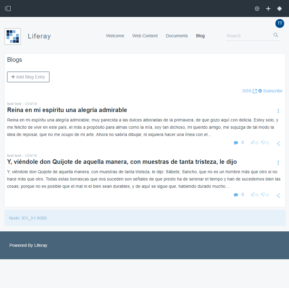 - Blog. Página con el portlet de blogs y dos entradas de blog sencillas.
