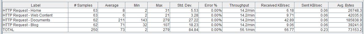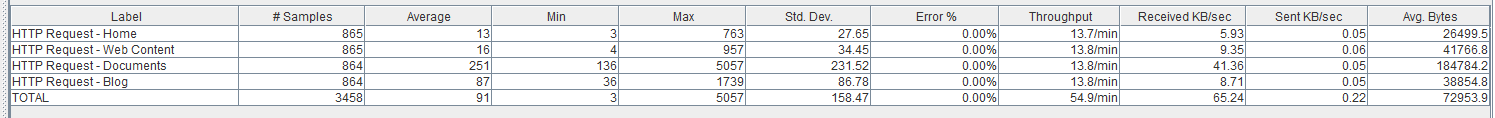 Lo importante de esta prueba es saber el punto de partida, es decir, el tiempo que tardan las páginas en condiciones ‘holgadas’. Con esta información también podemos ver cuáles son las páginas más ligeras y las más pesadas. Por ejemplo, vemos que ‘Home’ y ‘Web Content’ son muy rápidas, luego viene ‘Blogs’, y finalmente la página de Documentos, que comparativamente es mucho más pesada.
