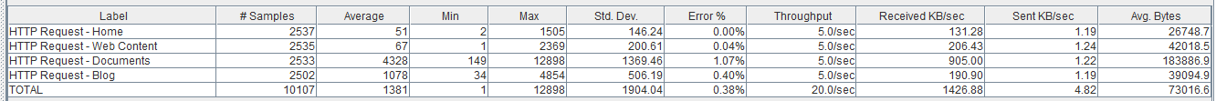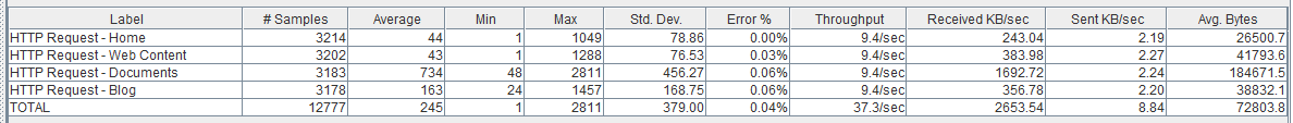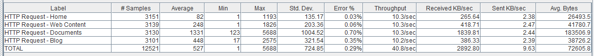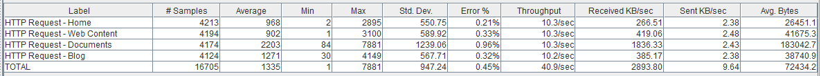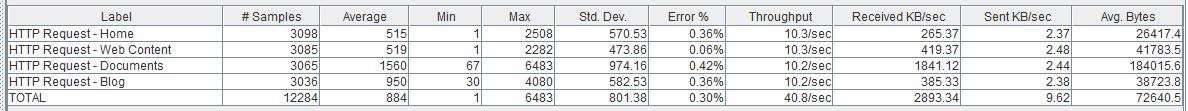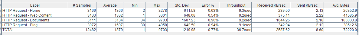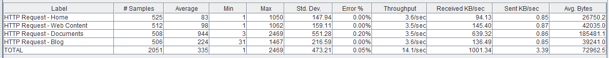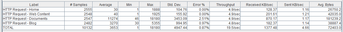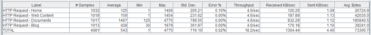 Como vemos la página de Documents no se ha resentido mucho respecto el escenario anterior, ni tampoco la tasa de error, sin embargo, vemos como las páginas ‘ligeras’ (como la ‘Home’ y Web Content) sí que se han resentido bastante pasando a tardar una media de 0,5 segundos.
