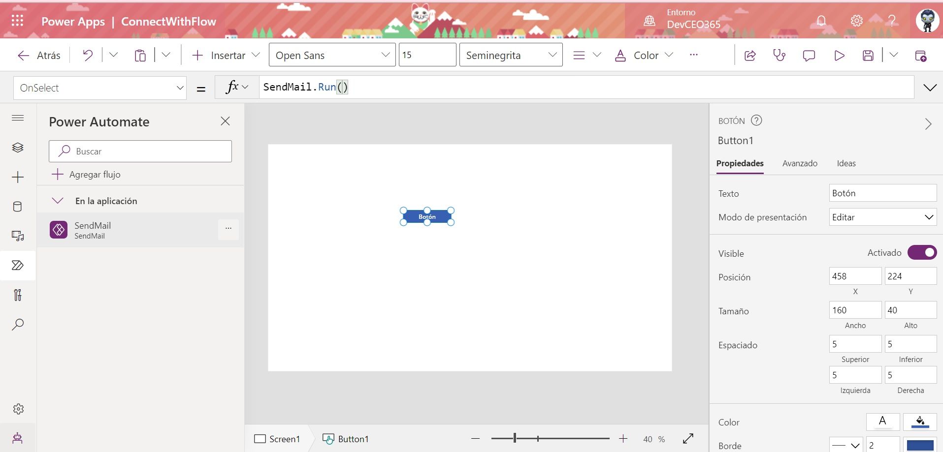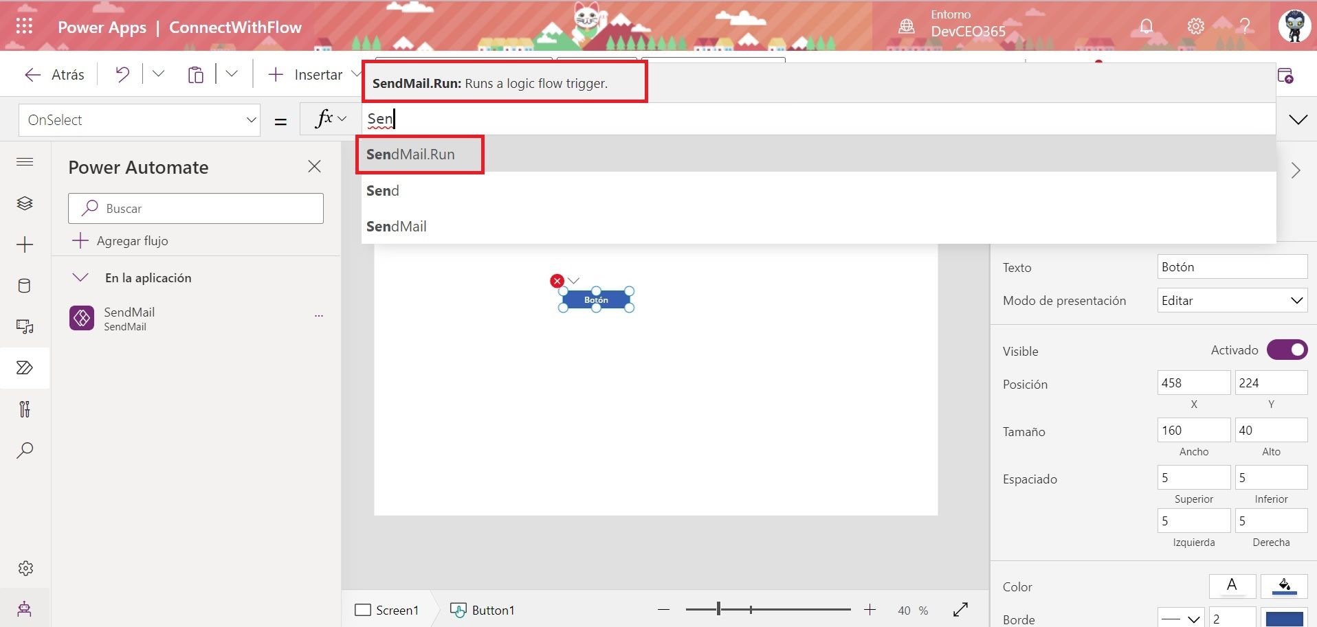Lo primero que haremos será añadir un botón. Seleccionamos el botón y en la barra de fórmulas, en el método OnSelect comenzamos a escribir el nombre de nuestro de flujo y nos aparecerán las opciones que podemos realizar con el flujo.