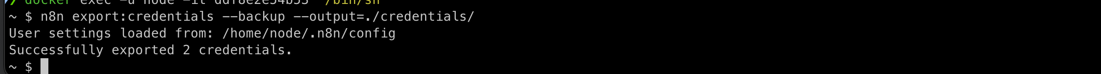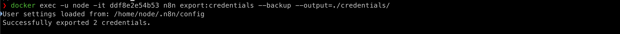 docker exec -u node -it $ID n8n export:credentials --backup --output=./credentials/Donde $ID es el nombre del contenedor y $COMANDO_N8N es la instrucción de n8n que se quiere ejecutar.