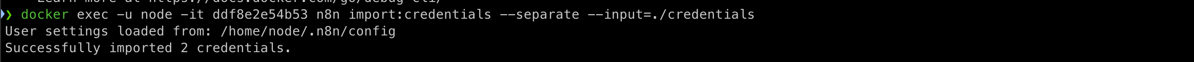 docker exec -u node -it $ID n8n import:credentials --separate --input=./credentialsDonde $ID es el nombre del contenedor y $COMANDO_N8N es la instrucción de n8n que se quiere ejecutar.