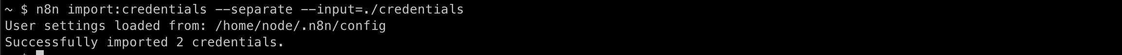 n8n import:credentials --separate --input=./credentialsEjemplo de ejecución de la importación en un directorio con credenciales independientes.