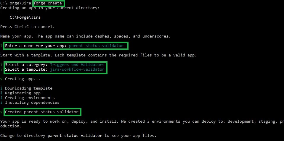 En este paso vamos a crear nuestra primera app con Forge, que será un validador para Jira. Este validador permitirá controlar que una subtarea no avance a un determinado estado si la tarea padre no se encuentra en una categoría de estado IN PROGRESS, es decir, no se podrá empezar a trabajar en una subtarea si la tarea padre no ha sido iniciada.