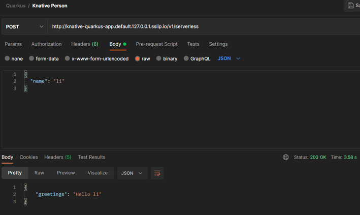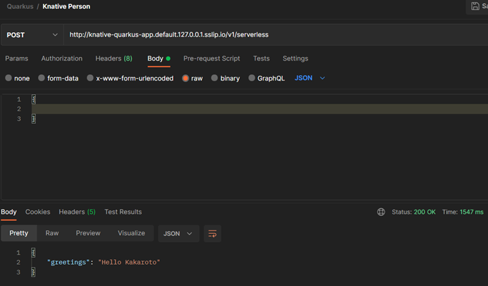 curl --location --request POST 'http://knative-quarkus-app.default.127.0.0.1.sslip.io/v1/serverless' \