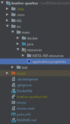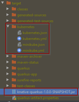 <<artefactId>>+<<version>>+”.jar”: Corresponde al empaquetado final del artefacto Quarkus construido.kubernetes: Archivos propios de K8s o Minikube que contiene la configuración necesaria para construir los Kubernetes/Minukube Deployments y Services de la aplicación.