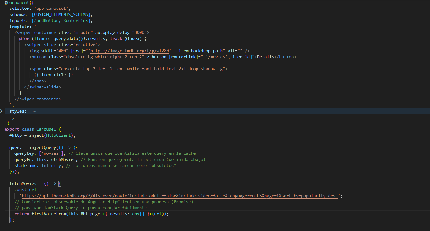 queryKey: identificador único de cada consulta (clave para el caché).queryFn: función que obtiene los datos (promesa olastValueFromsi usas RxJS).staleTimeycacheTime: diferencia entre “datos frescos” y “datos en caché”.enabled: para ejecutar queries condicionalmente.refetchOnWindowFocusyrefetchInterval: control de actualizaciones automáticas.useQueries: ejecución paralela de múltiples queries (como en tu ejemplo de detalle de película).
