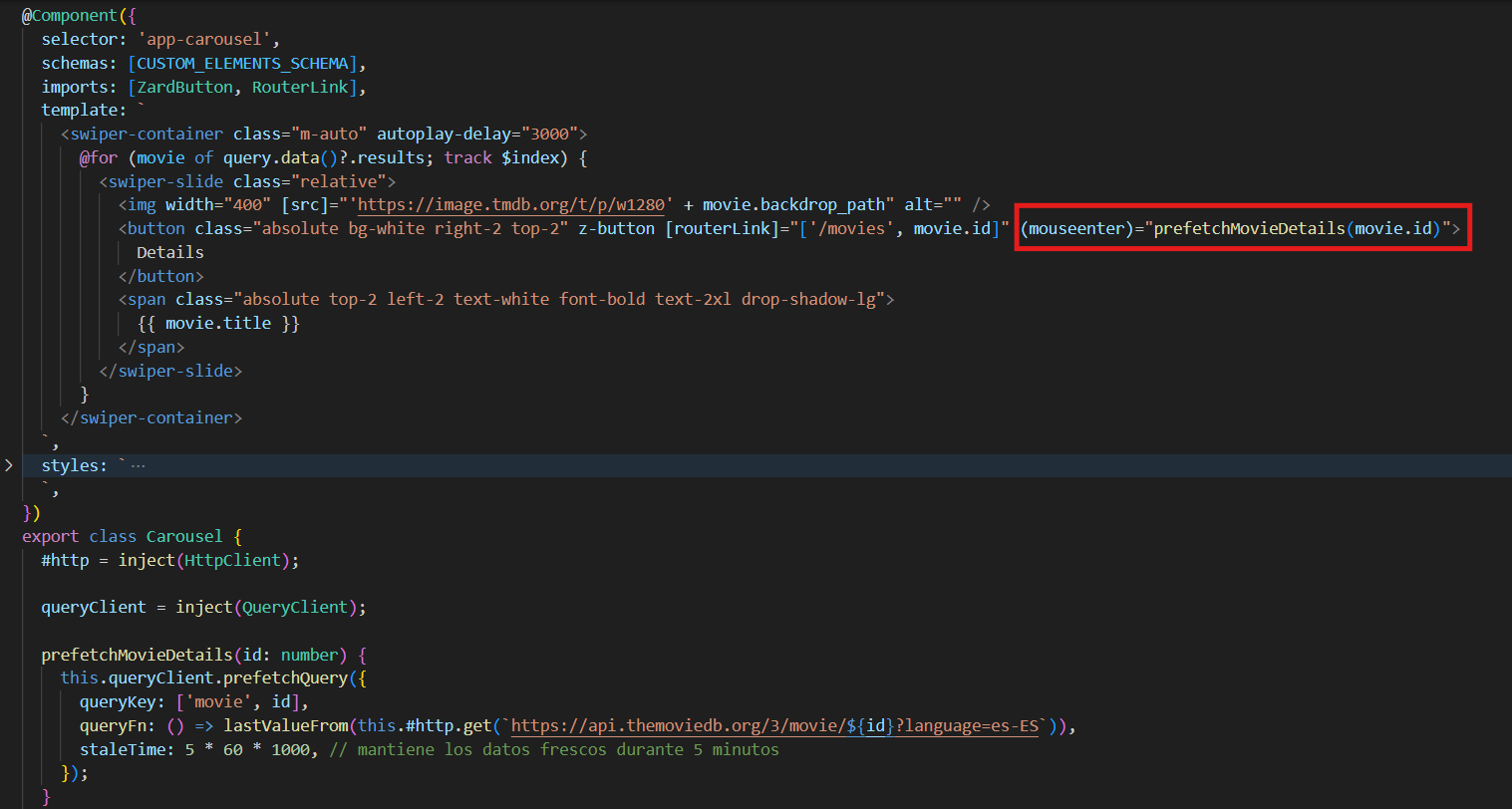 El primer escenario es la landing page con un carrusel de películas. Aquí queremos que, una vez cargadas las películas, permanezcan en caché para que cuando el usuario regrese a la página (desde una página de detalles) no se realice otra solicitud innecesaria. Esto lo logramos configurando un staleTime que defina el tiempo durante el cual los datos se consideran frescos.