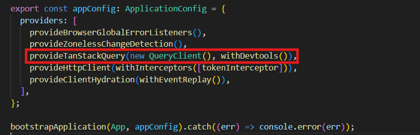 El provider provideTanStackQuery(...) es el encargado de inicializar un QueryClient de TanStack Query y exponerlo dentro del contexto de Angular. Además, se habilita withDevtools(), fundamental porque es lo que permite que la extensión de TanStack Devtools detecte el cliente y muestre en tiempo real el estado de las queries, mutations y el caché de datos de la aplicación.