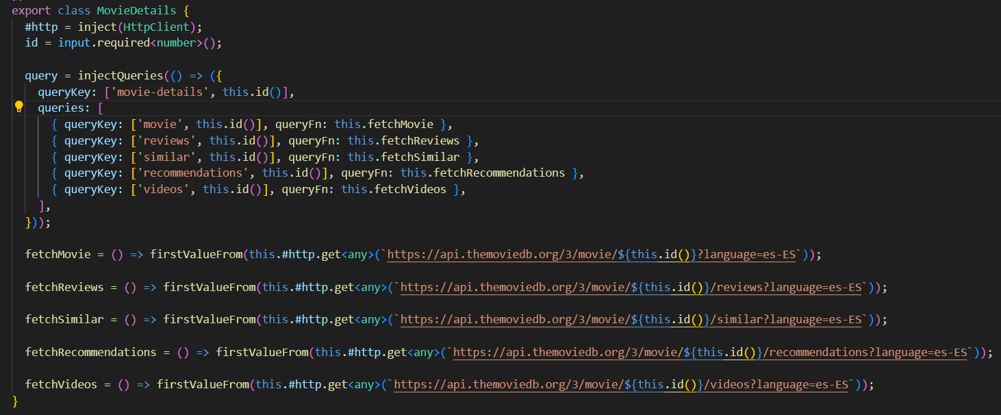 { queryKey: ['movie', this.id()], queryFn: this.fetchMovie },