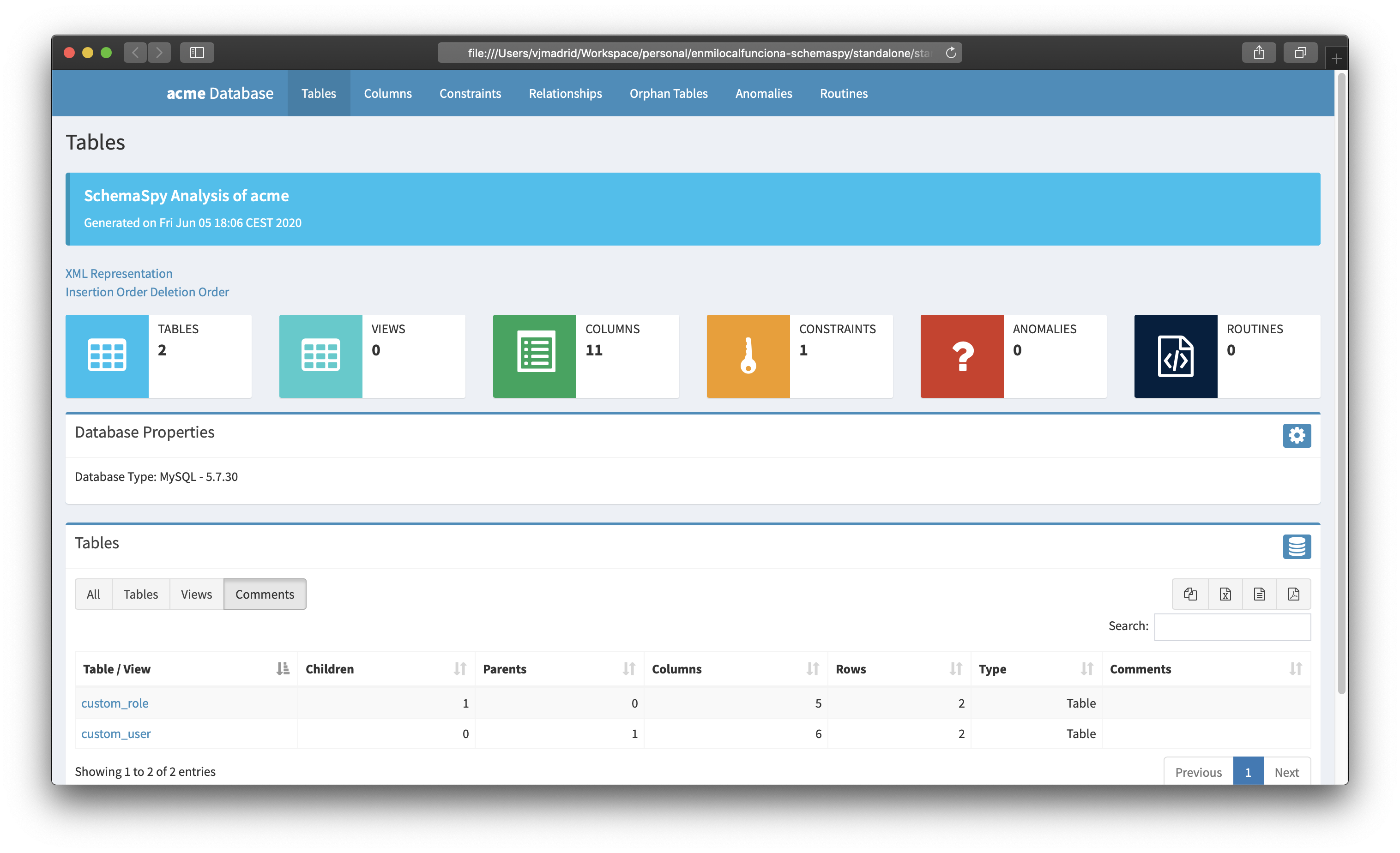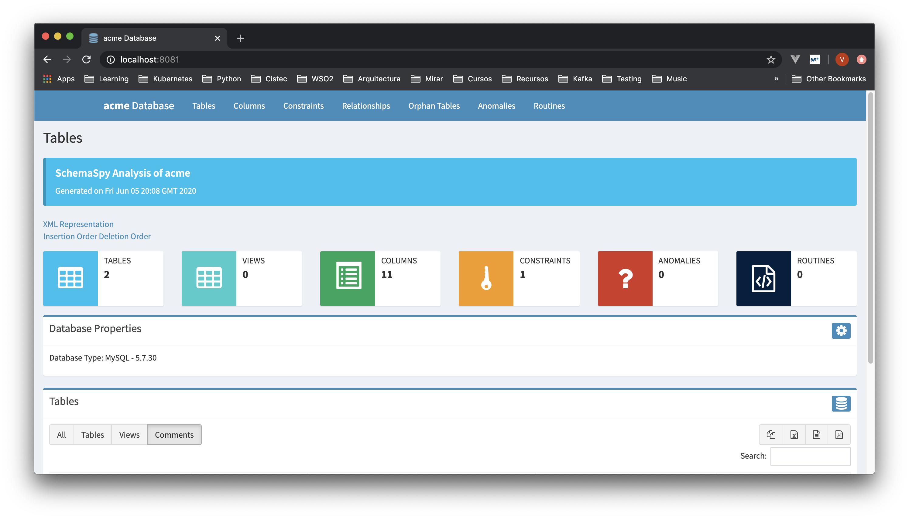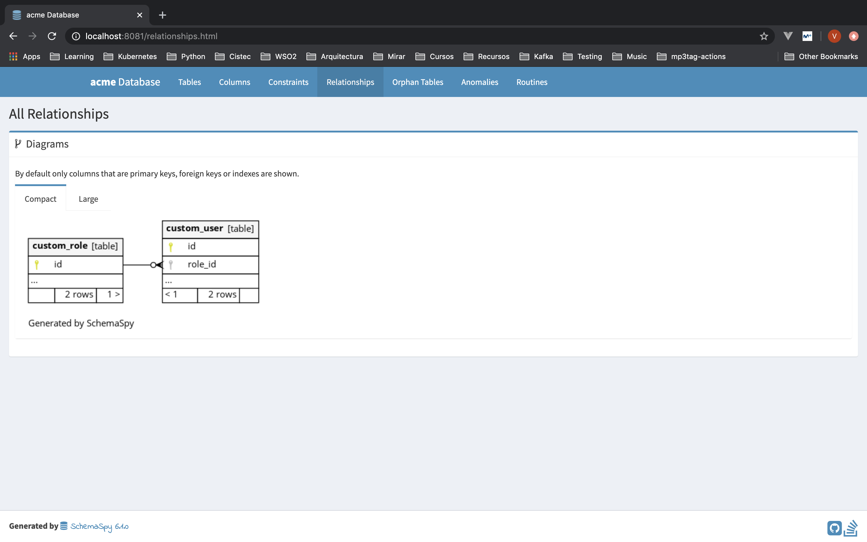 java -jar schemaspy-6.1.0.jar -t mysql -dp mysql-connector-java-6.0.6.jar -host 127.0.0.1 -port 3306 -u test -p test -db acme -s acme -o output